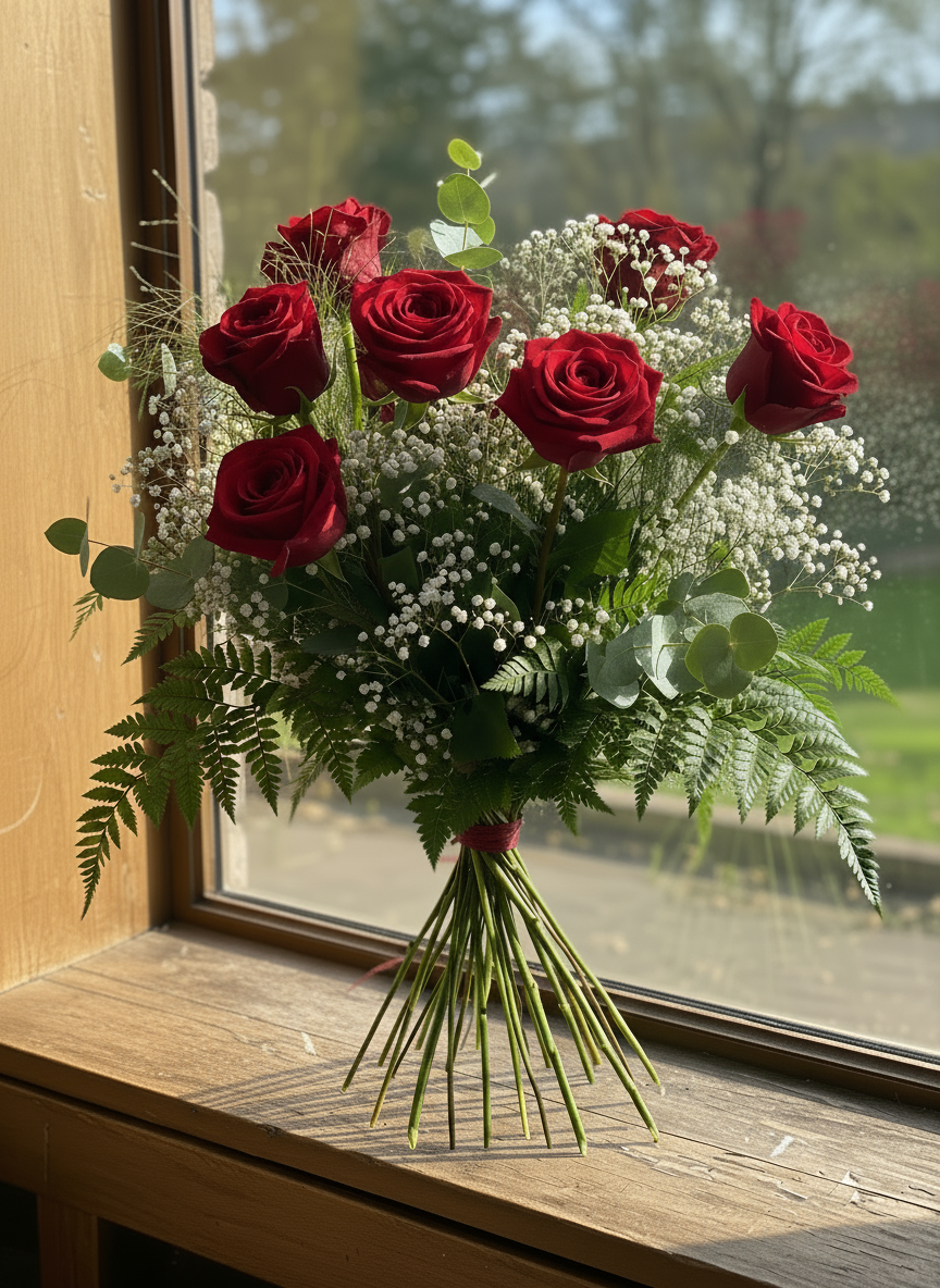 Sieben tiefrote Rosen stehen für Liebe, Leidenschaft und Reue. Zartes Schleierkraut legt sich wie eine sanfte Entschuldigung um das Herz, während Panicum-Gräser und Lederfarn dem Strauß eine natürliche, aufrichtige Note verleihen