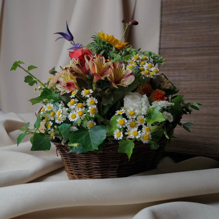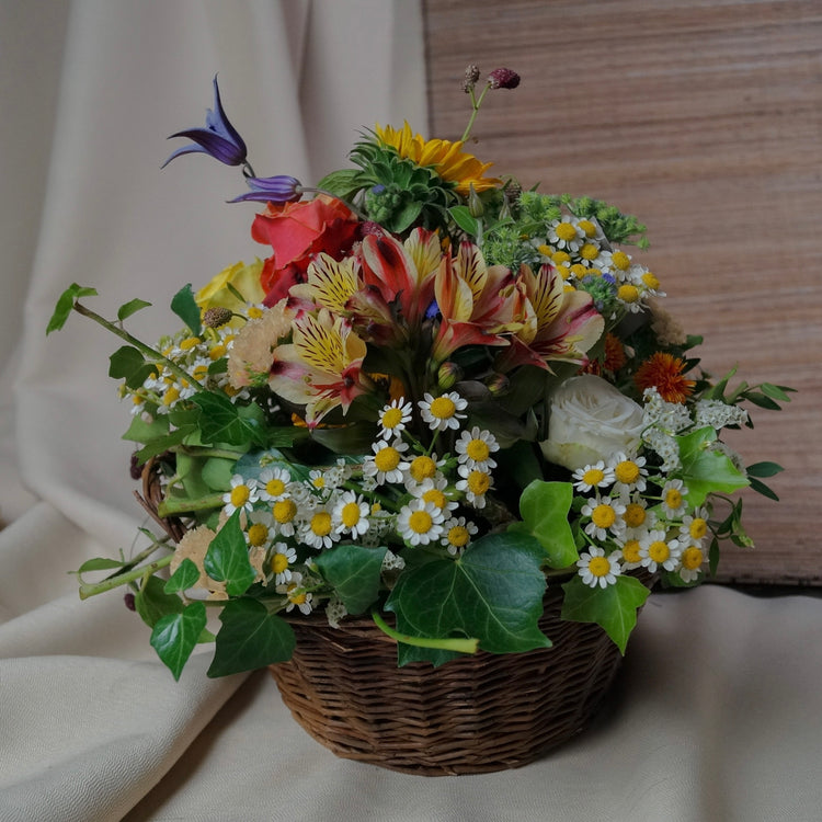 Besuchen Sie die wunderschöne Blumenwelt des Blumenkorbs Sunflower. Rattankorb gepaart mit einem Gesteck aus frischen Sunflower-Blüten, begrüßt Sie dieser exquisit gefertigte Korb in einer sanften, sommerlichen Farbe. Ein Geschenk mit seltener Schönheit und Ausdruck.