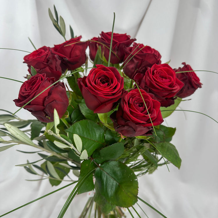 Rote Rosen sind die perfekte Wahl, um Liebe und Zuneigung auszudrücken. Mit einem satten, tiefen Rotton, der seine Wirkung niemals verfehlt. Ein Symbol für Wärme, Freundschaft und Verbundenheit. Gebunden mit ausgewähltem Grün und zarten Bärengräser.