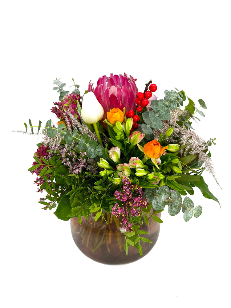 Exotische Protea Blüte mit bunter Zusammensetzung von verschiedener Blütenkraft und Grünabschluss
