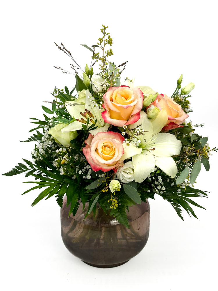 Paloma Rosen und Schleierkraut mit weißen Lilien und abwechslungsreicher Blütenfüllung