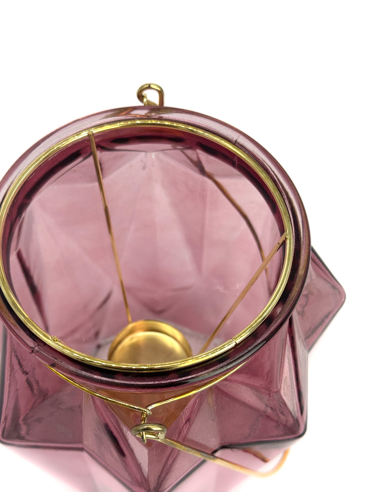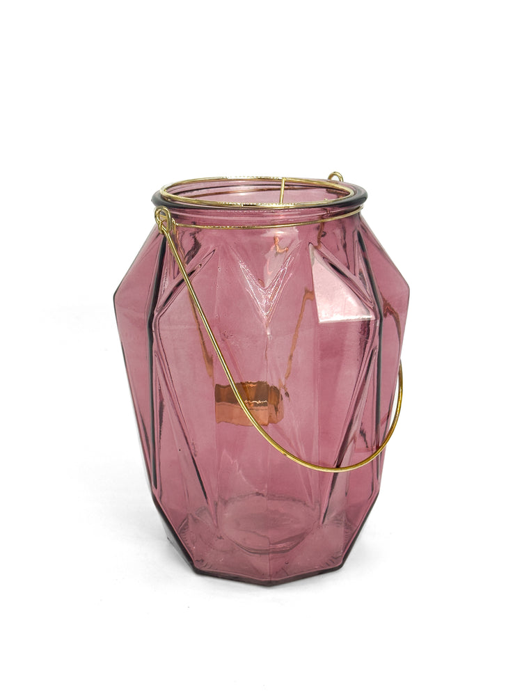 Rosa gefärbte Glasvase mit Teelichteinsatz und Henkel in Gold für stimmungsvolles Ambiente