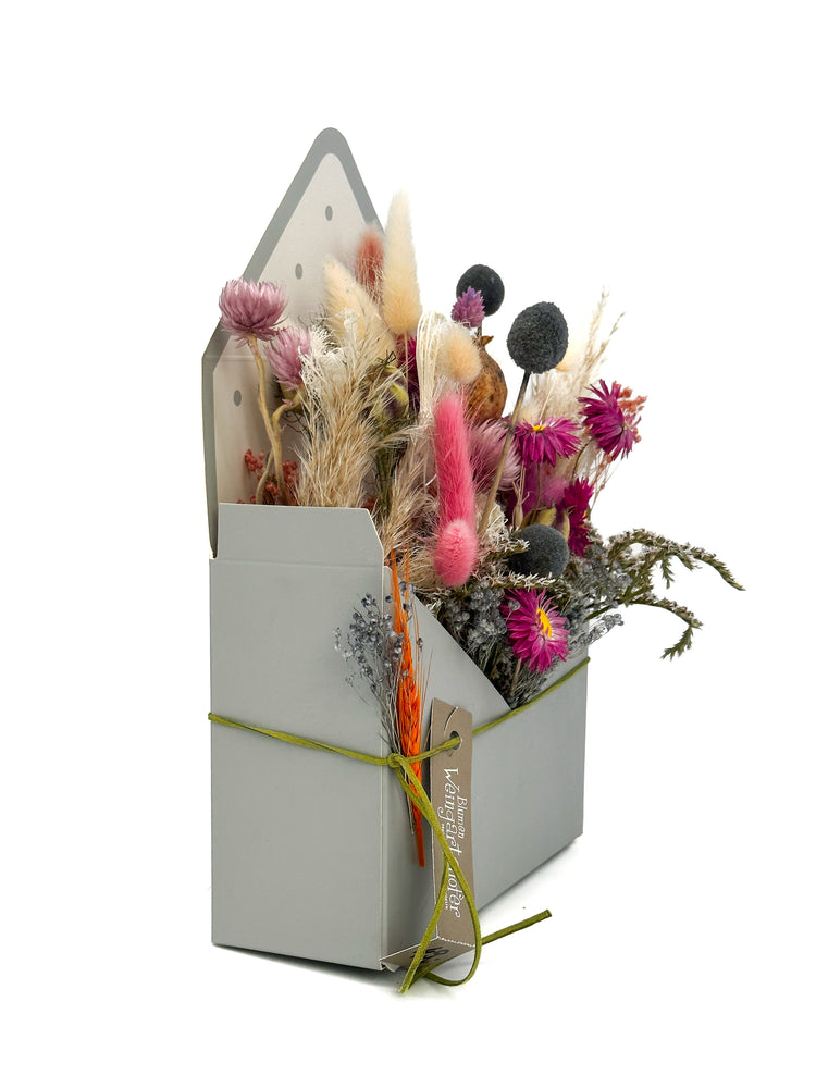 Mit witziger Packerl Verpackung ein bunter Farbverlauf mit bestens getrockneten Blumen für die Ewigkeit