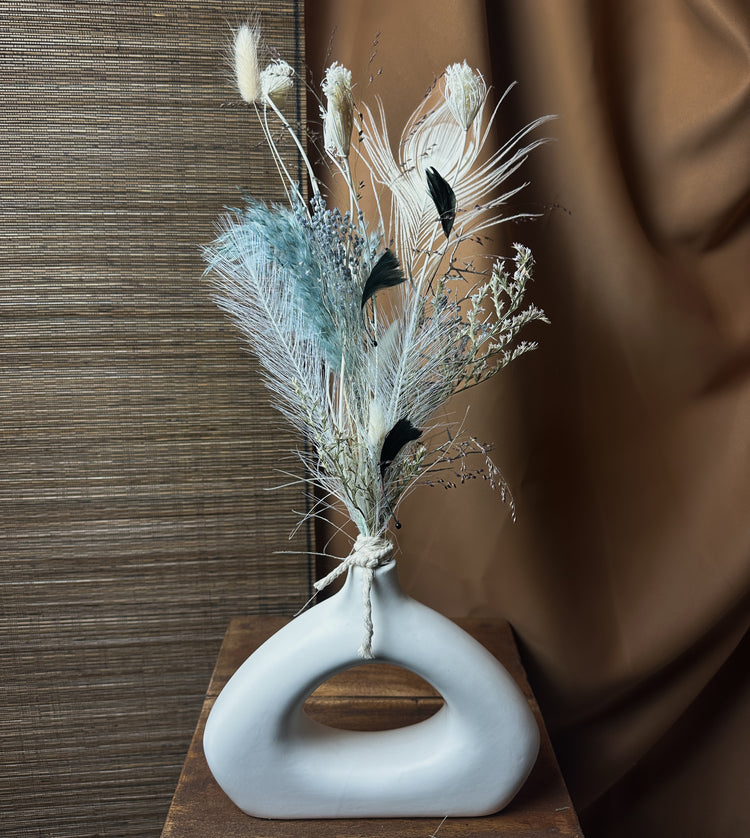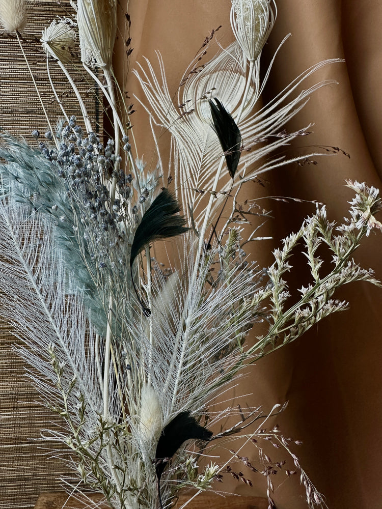 Moderne Raumdekoration mit getrockneter Floristik und Dekor