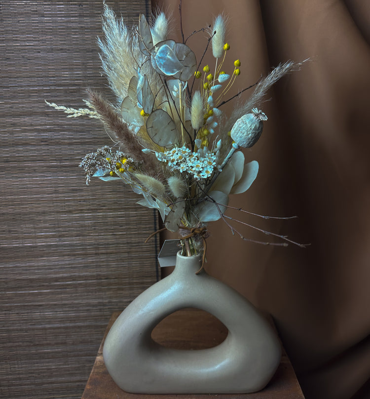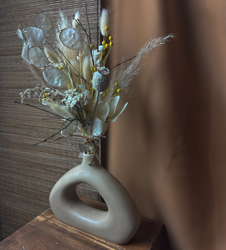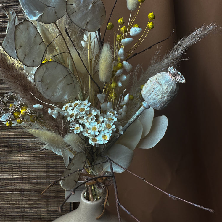 Moderne Raumdekoration mit getrockneter Floristik und Dekor inklusive Keramik Vase