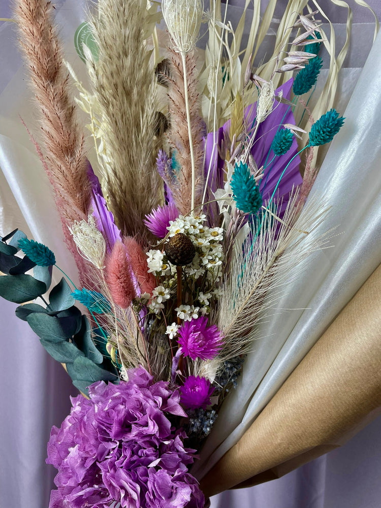 Schmück dein Zuhause mit dem dekorativen Trockenblumenstrauß `Amilia! Mit seiner seltenen Kombination aus lila und türkis Blüten, wirkt dieser Strauß wirklich erfrischend und versprüht eine coole und luftige Atmosphäre! Plus: die trockenen Blumen sind praktischerweise langlebig und heißen keine extra Pflege.
