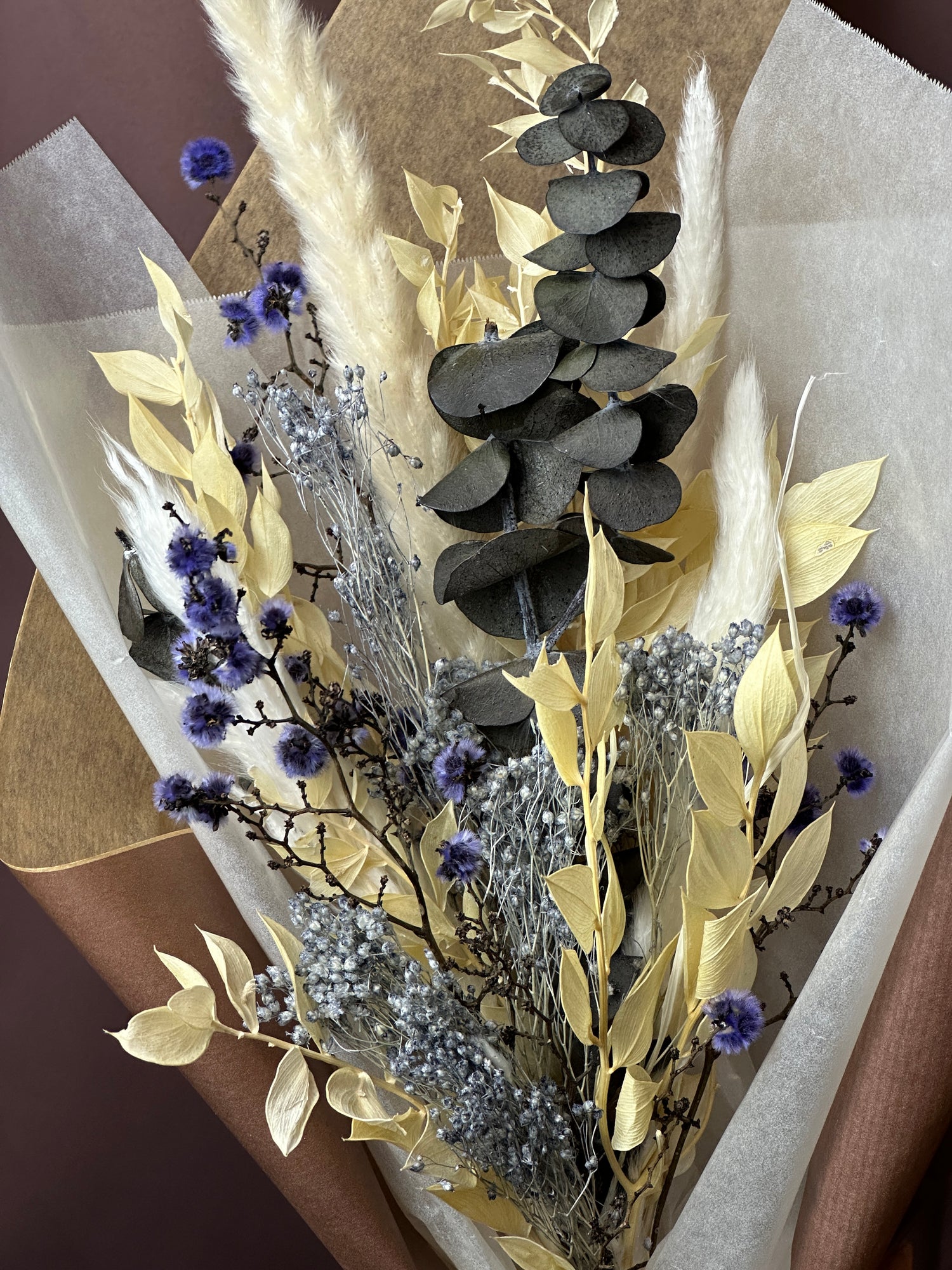 5 verschiedene Blumenarten mit Eukalyptus, Cortedia, Natur-Ruscus